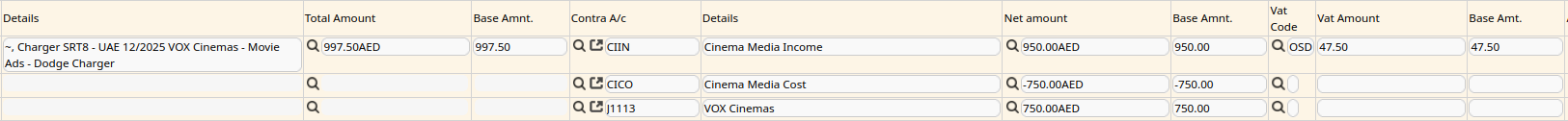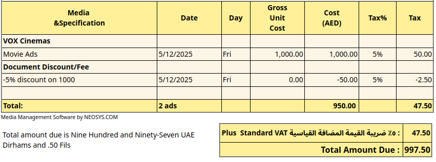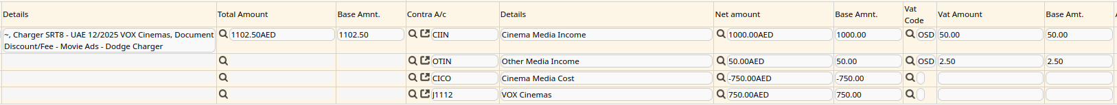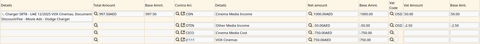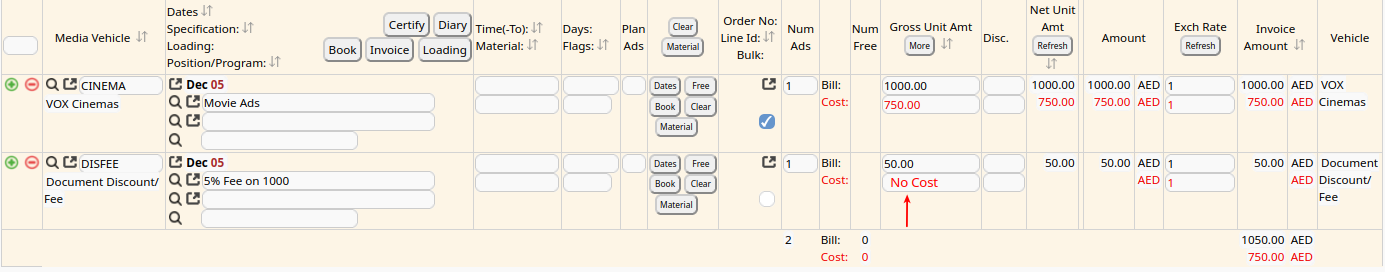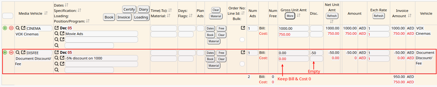 • Enter '50AED' Gross amount and '-200%' in any field, for example 'Discount' (This adds a positive balance to Gross Unit Amt total in Media Diary, which you may not prefer).